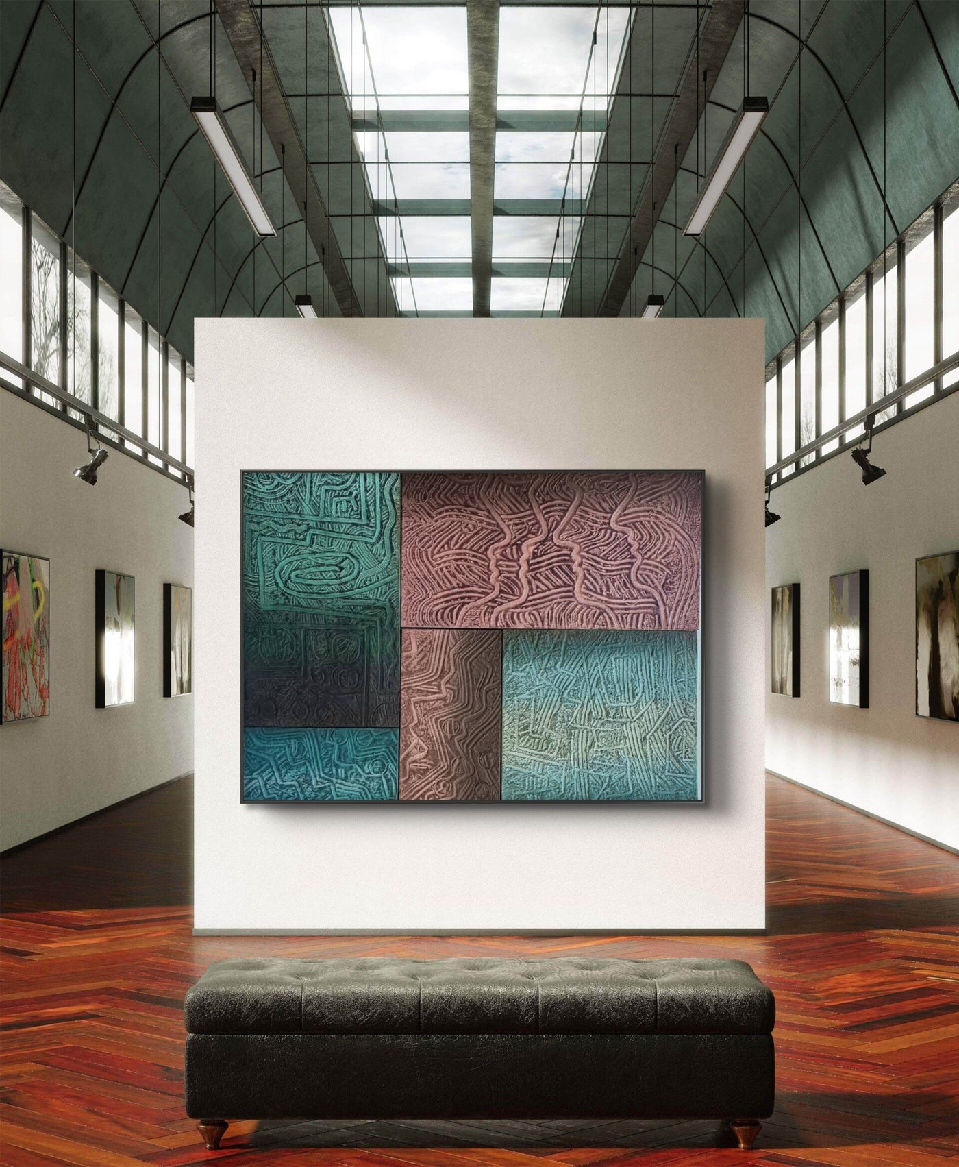 Recuerde que el arte es un viaje profundamente personal y su expresión única resonará de manera diferente en cada espectador. Continúe confiando en sus instintos y creatividad; los resultados son realmente convincentes. This artwork is a captivating exploration of texture and color, presented in a series of rectangular panels that each offer a unique visual narrative. The choice of earthy and jewel tones—deep browns, greens, reds, and blues—creates a harmonious yet dynamic interplay that catches the eye. The textured surface of each panel hints at a meticulous technique, with elaborate, almost labyrinthine designs carved or etched into each segment. This creates a sense of movement and depth, inviting viewers to explore each part of the piece individually and as a whole.