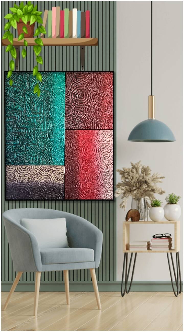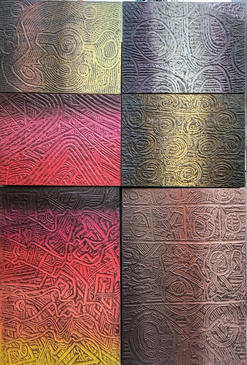 Recuerde que el arte es un viaje profundamente personal y su expresión única resonará de manera diferente en cada espectador. Continúe confiando en sus instintos y creatividad; los resultados son realmente convincentes. This artwork is a captivating exploration of texture and color, presented in a series of rectangular panels that each offer a unique visual narrative. The choice of earthy and jewel tones—deep browns, greens, reds, and blues—creates a harmonious yet dynamic interplay that catches the eye. The textured surface of each panel hints at a meticulous technique, with elaborate, almost labyrinthine designs carved or etched into each segment. This creates a sense of movement and depth, inviting viewers to explore each part of the piece individually and as a whole.