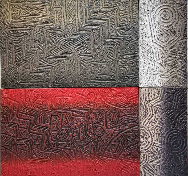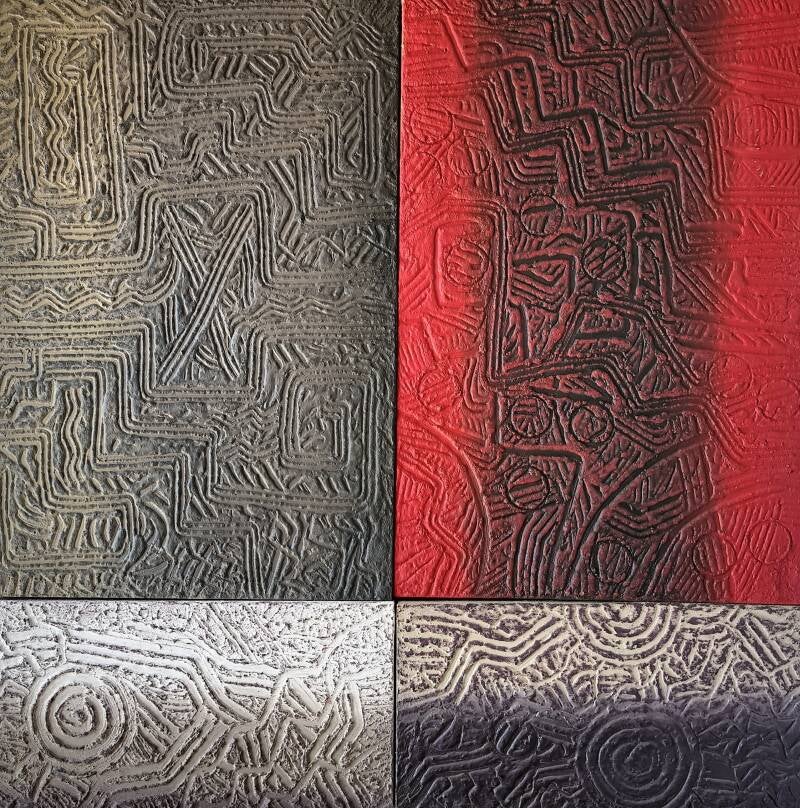 The artwork presented is a striking composition, divided into segments, each depicting intricate patterns reminiscent of ancient engravings or petroglyphs. The dominant elements within these segments are curved and linear engravings that swirl and intersect, creating a tapestry of textures