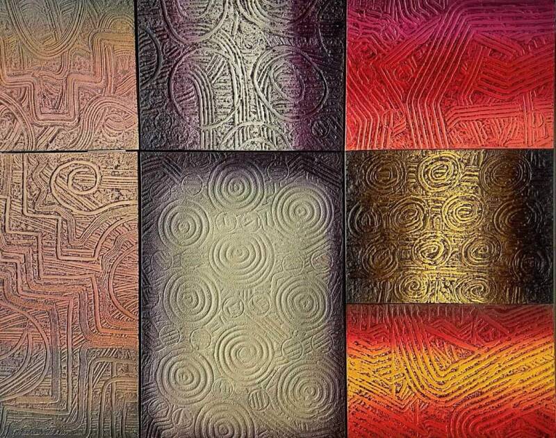 The use of texture is commendable, as it adds a tactile element to the visual experience. This richness invites the viewer to ponder the underlying narrative or emotion behind the intricate designs. The color palette contributes to an earthy, grounded feeling while maintaining a contemporary edge. Each panel communicates individually yet contributes to a cohesive whole, masterfully balancing complexity and unity.